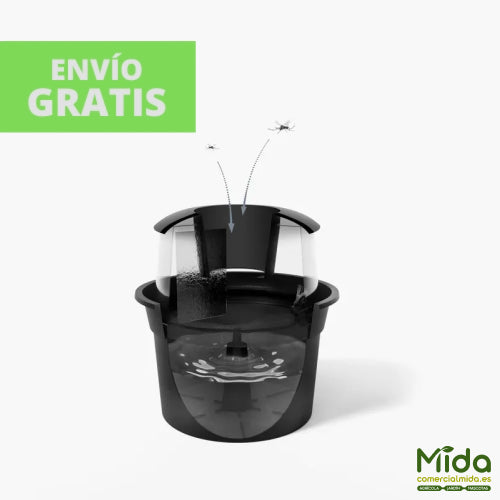 Trampa de exterior para capturar hembras de Aedes que ya han picado y buscan poner huevos, reduciendo la reproducción y las picaduras futuras.
