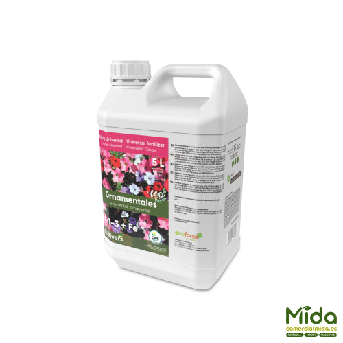 Abono Plantas Ornamentales Líquido Ecológico es un fertilizante orgánico líquido formulado para favorecer un desarrollo uniforme en plantas ornamentales (de hoja y de flor), tanto en maceta como en jardín. Su aporte de aminoácidos ayuda a la planta a mantener el ritmo de crecimiento en periodos de estrés (frío/calor), mientras que el hierro quelatado (Fe-EDTA) potencia la fotosíntesis, mejorando el verde intenso del follaje y el aspecto general de la planta.