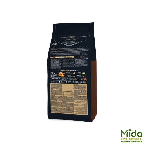 OWNAT Author Grain Free Fresh Rooster es un alimento completo para perros adultos, formulado sin cereales y elaborado con 60% de carne fresca de gallo de corral, que aporta proteínas de alto valor biológico y un perfil energético elevado. La receta se refuerza con semillas de chía (fuente natural de omega 3 y fibra) y con cúrcuma, orientada a apoyar la digestión y ayudar a la respuesta inflamatoria. Incorpora también prebióticos FOS/MOS, yucca schidigera y soporte articular con glucosamina y condroitina.