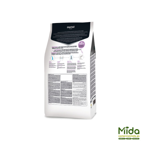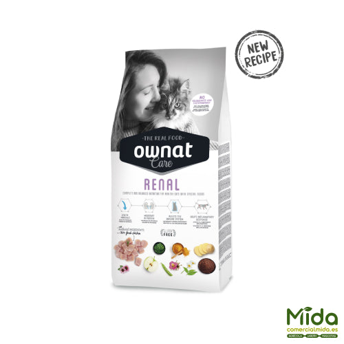 OWNAT Care Renal es una fórmula orientada a gatos adultos con necesidad de control mineral y proteína moderada para reducir la carga renal, destacando niveles bajos de calcio y fósforo, además de sodio y magnesio, coherentes con el posicionamiento renal.
