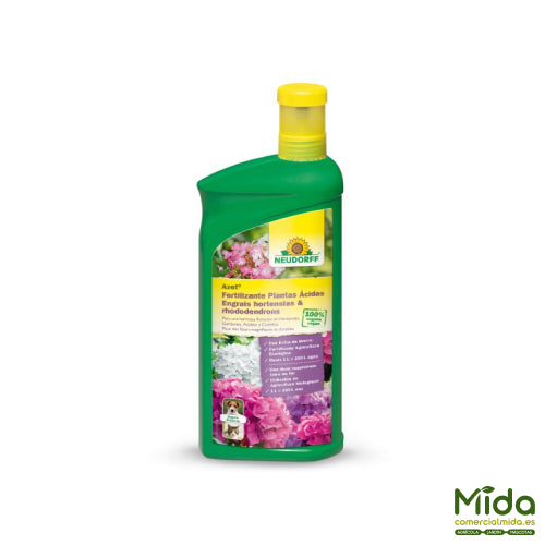 NEUDORFF Azet Fertilizante Plantas Ácidas es un abono orgánico líquido formulado para plantas acidófilas, con composición NPK (Fe) 3-3-3 (0,3). Está elaborado con materias primas 100% vegetales (extracto de maíz), aportando una nutrición equilibrada y bien tolerada. Su aporte de hierro (Fe) ayuda a mantener hojas más verdes y a mejorar el estado general en especies sensibles a la clorosis. Está pensado para favorecer una floración abundante y llena de color, tanto en plantas de interior como de exterior. Complementa especialmente la nutrición de hortensias, azaleas, brezos y camelias, aportando de forma natural los oligoelementos necesarios.