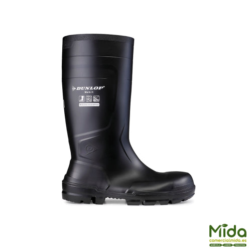 La Dunlop Work-It S5 Black (NB2HD01) es una bota de seguridad industrial de PVC 100% impermeable (waterproof) y a prueba de fugas, concebida para uso general en entornos exigentes. Incorpora puntera y entresuela de acero para protección frente a impactos y perforaciones, manteniendo un diseño ligero y moderno para jornadas largas. La suela con categoría máxima antideslizante SR aporta agarre y estabilidad en superficies complejas, incluso con aceites/fueloil (FO). Su construcción antiestática y con absorción de energía en talón mejora la seguridad y el confort operativo.