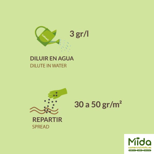 • Repartir en superficie: 30 a 50 g/m², y regar después para facilitar su incorporación.