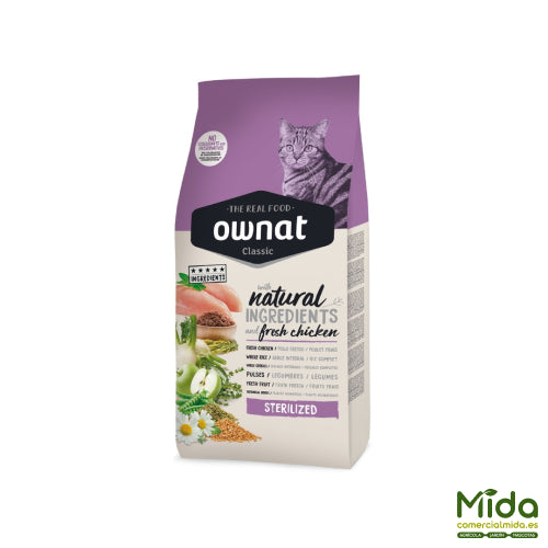 The I think Classic Cat Sterilized of Ownat is a type of dry food indicated to complete the diet of sterilized cats who suffer from problems or who have a tendency to overweight . This I think of premium quality incorporates fresh meat and 100% natural ingredients in your recipes. Its composition is free of dyes, artificial additives and dyes and only incorporates components with a low fat content to reduce calories and maintain optimal weight. The level of proteins and fibers is high to ensure the proper maintenance of muscle mass a moderate percentage of fat , for ensure ideal weight of the felines. The recipe includes easy to digest brown rice , fresh fruit that acts as a powerful natural antioxidant , aromatic plants that improve the digestive wellness and brewer's yeast for complete protection of the immune system . This food has a complete nutritional balance between components to ensure full physical condition of the felines. Complete the usual diet of pets and guarantees control of weight gain.