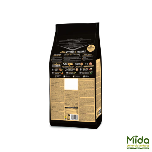 Pollo fresco* (15% mín. antes de la cocción), pavo fresco* (15% mín. antes de la cocción), pollo deshidratado (14%), trigo* (13%), hidrolizado de salmón (8%), arroz* (4%), raíces de mandioca* (4%), proteína de trigo, proteína de maíz, lignocelulosa, grasa avícola (preservada con antioxidantes naturales), cerdo deshidratado (3%), verduras y frutas frescas antes de la cocción (manzana* 1%, zanahoria* 0,5%, brócoli* 0,5%), levadura de cerveza* (2%), salmón deshidratado (2%), proteína hidrolizada de pollo, pulpa de remolacha, aceite de salmón (preservado con antioxidantes naturales), alfalfa deshidratada*, sal gema*, raíces de achicoria (FOS), productos de levaduras (MOS), algas marinas deshidratadas (500 mg/kg), glucosamina (500 mg/kg), condroitín sulfato (100 mg/kg), yucca schidigera, arándanos* (100 mg/kg), té verde* (80 mg/kg), equinácea* (80 mg/kg), flor de manzanilla* (80 mg/kg), hinojo* (80 mg/kg). *Ingredientes naturales.